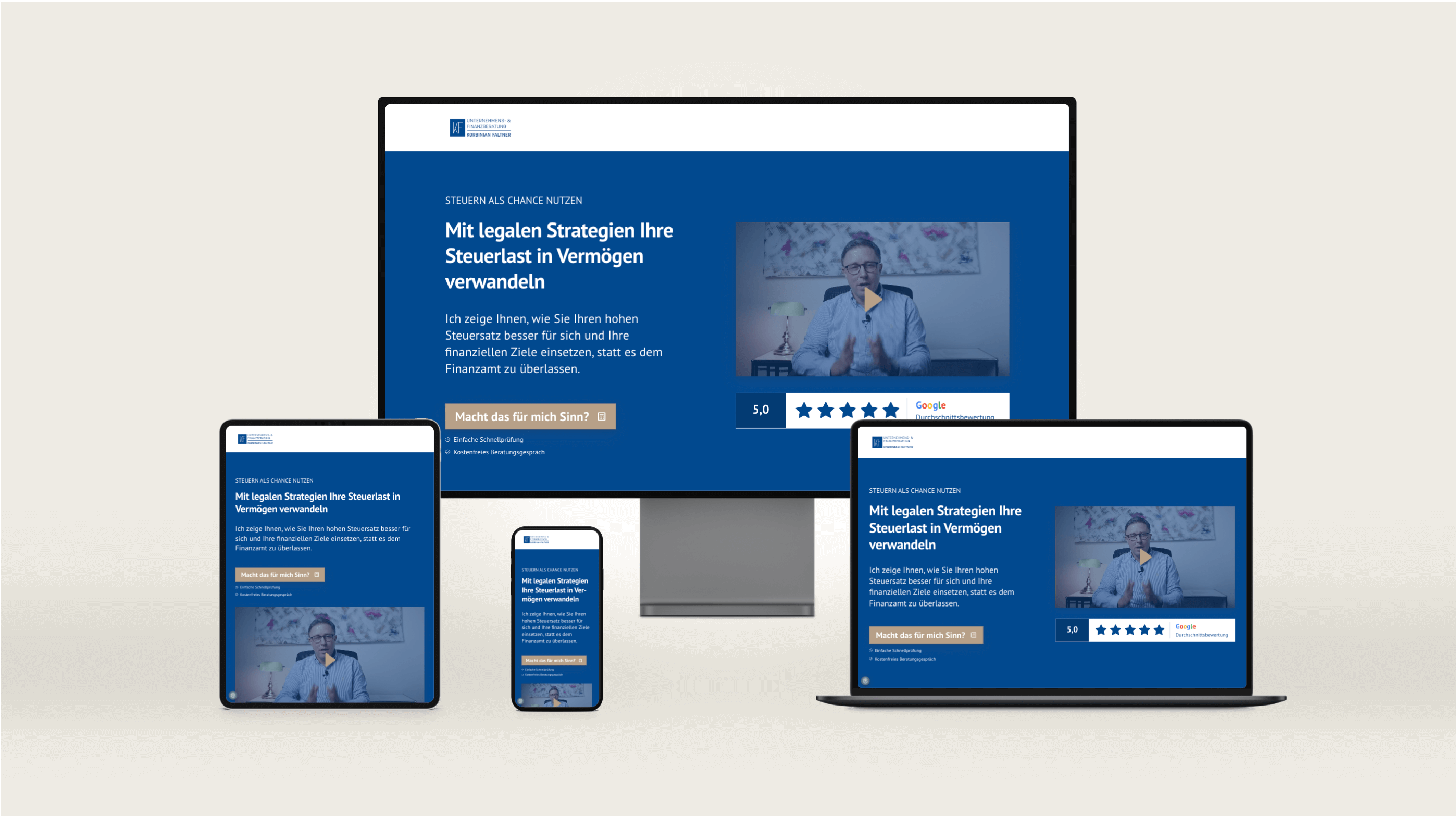 Damit Interessenten schnell einordnen können, ob das Thema für sie passt, haben wir die Landingpage als klaren Funnel konzipiert und in Contao umgesetzt: mit Steuersparpotenzial-Rechner, vertrauensbildenden Inhalten (Bewertungen, Kundenstimmen, persönliche Sektionen), Vergleichslogik sowie einer einfachen Kontaktaufnahme – verkaufspsychologisch sauber, aber angenehm unaufdringlich.