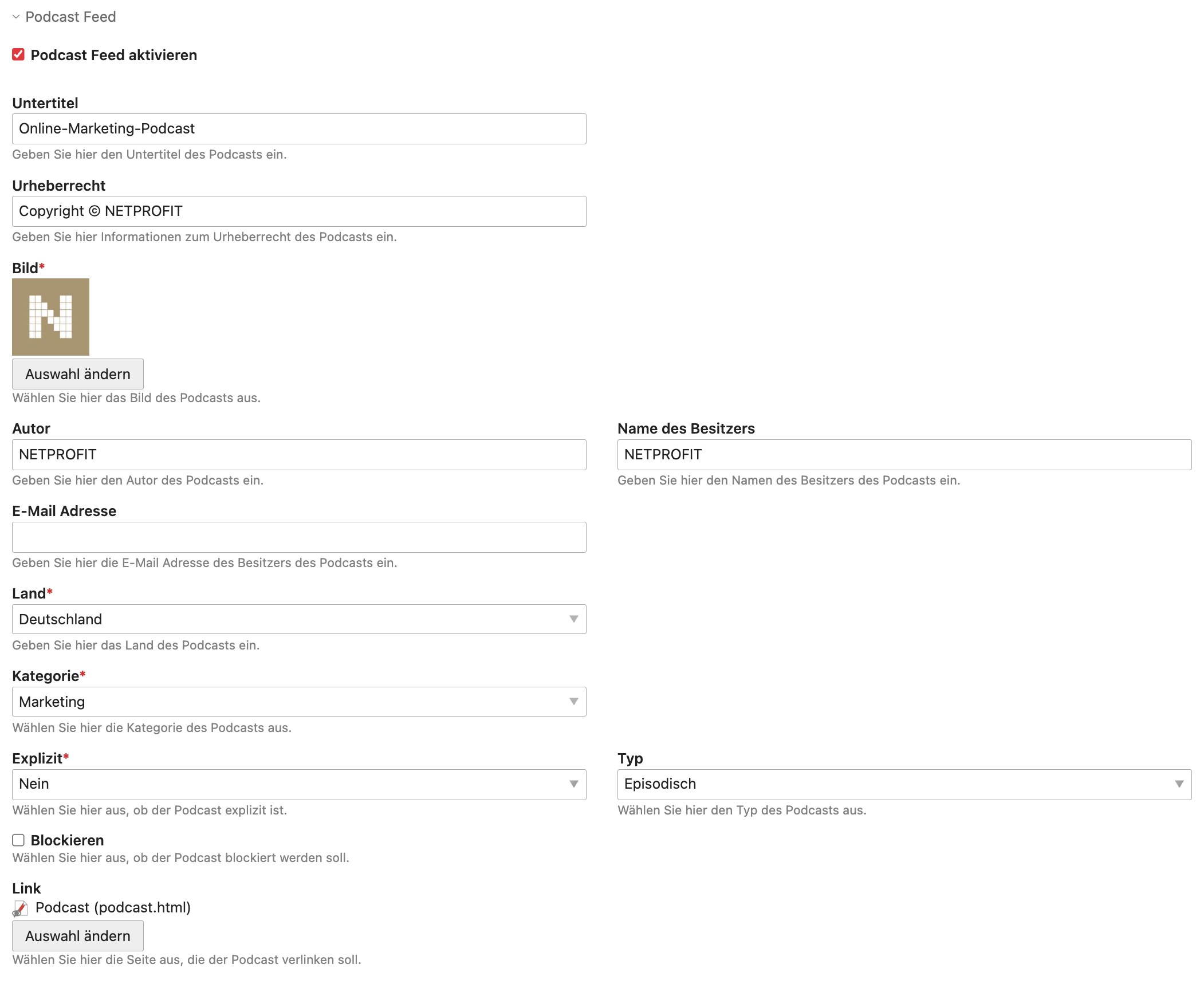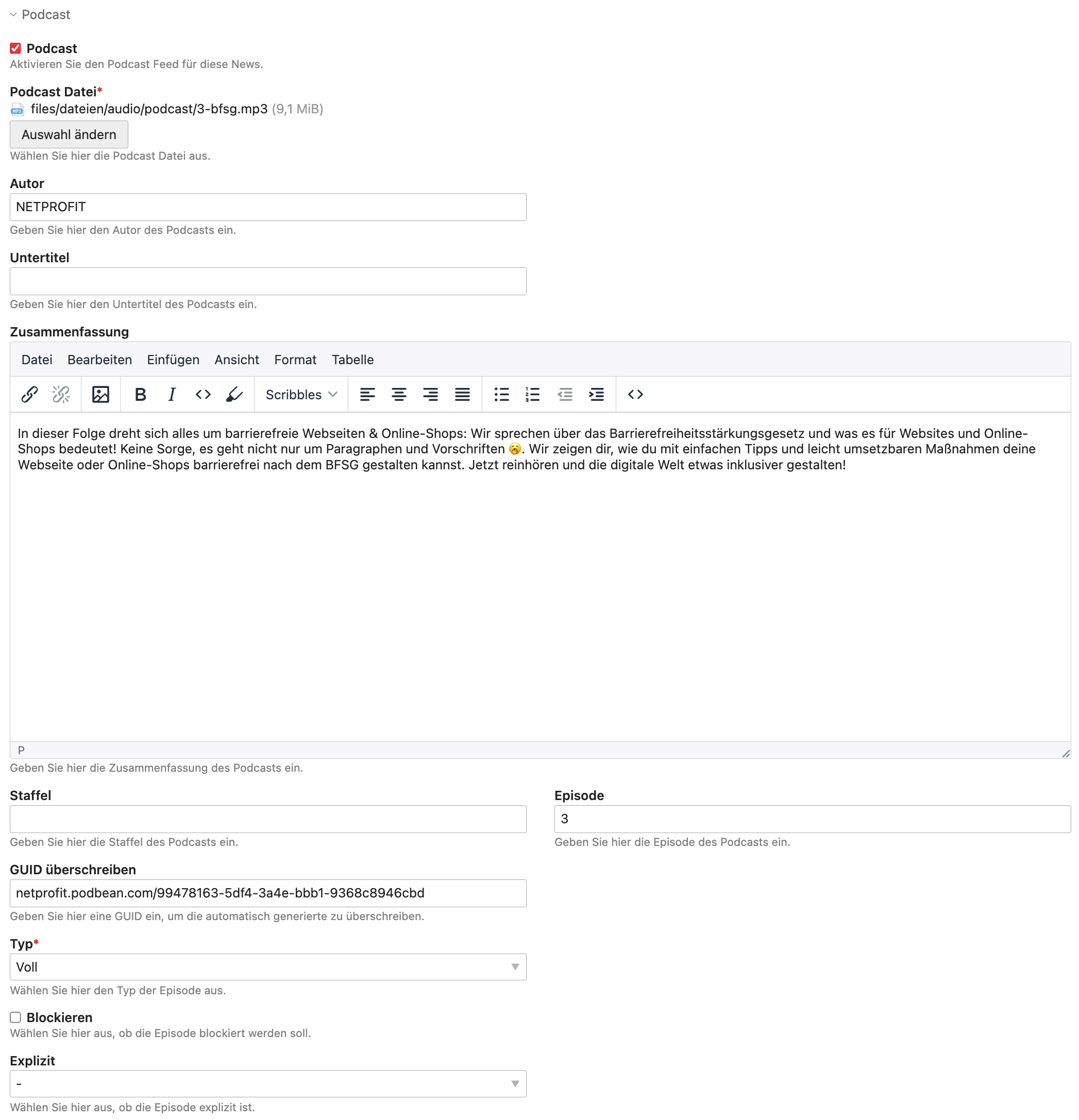 Neben generellen Feed-Einstellungen für den Podcast sind auch zusätzliche Eingabefelder je Episode vorhanden.