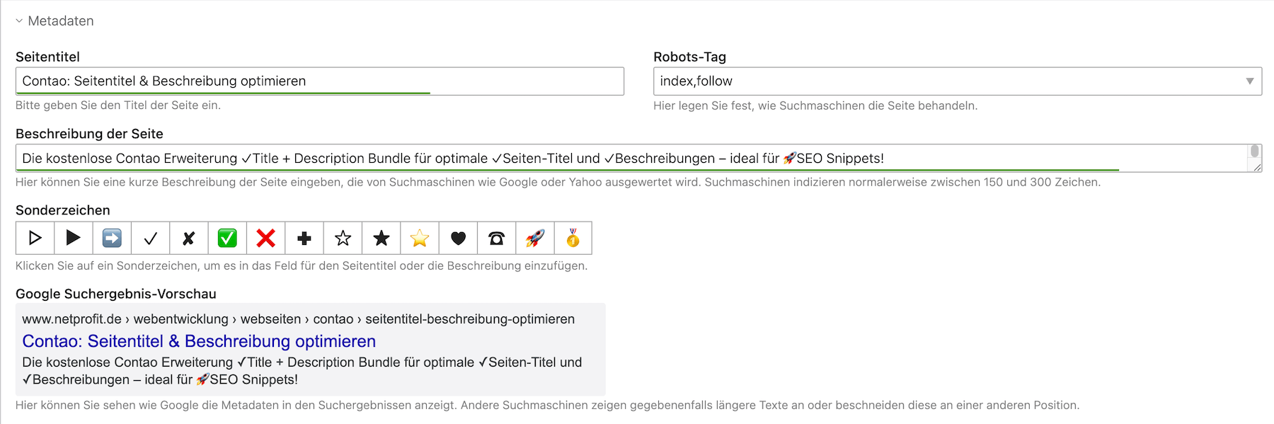 Inspiriert von der Snippet-Optimierung und Darstellung des beliebten Yoast SEO Plugins für WordPress ergänzt das Contao Title + Description Bundle die Funktion um einfache Sonderzeichenintegration sowie visuelle Darstellung empfehlenswerte Längen.